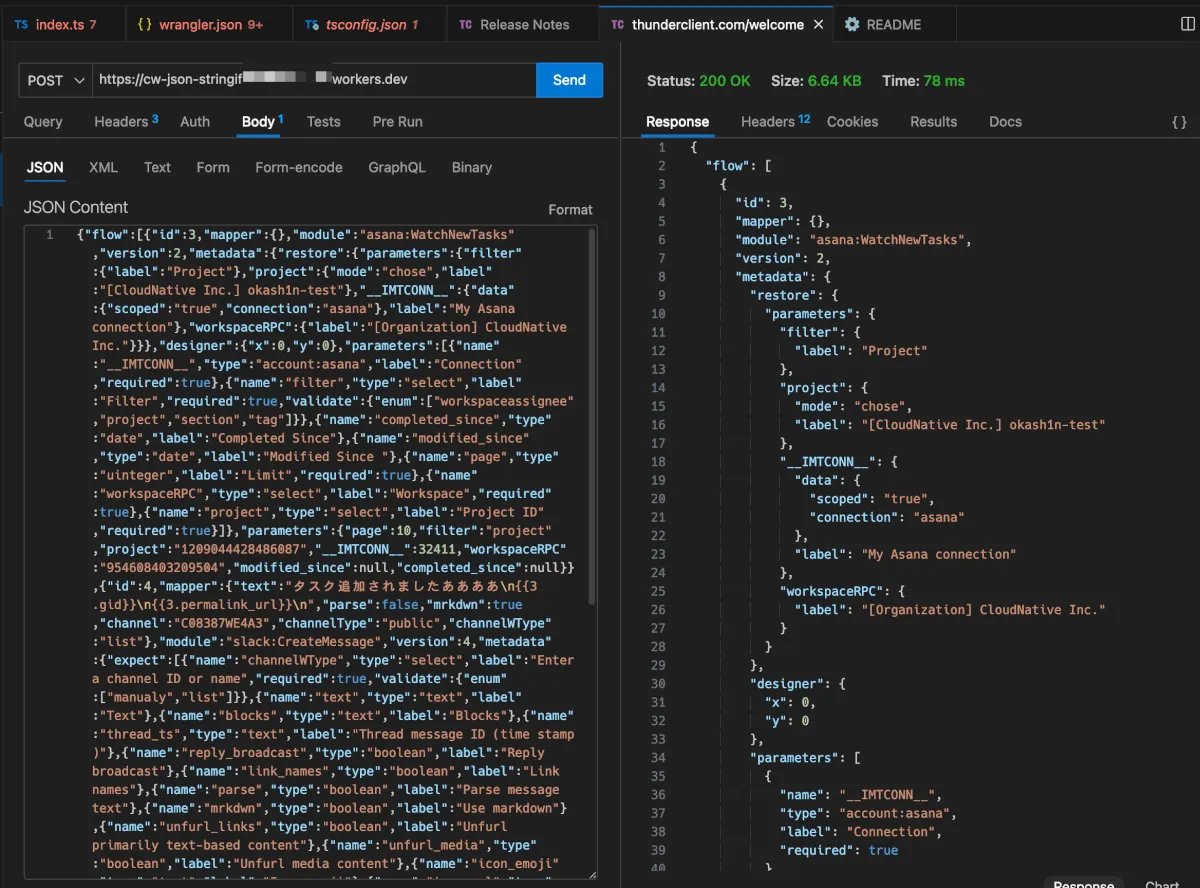 これをデプロイするとURLを発行してくれるのですが、そこに対してPOSTでbodyにJSONを入れてリクエストするだけです。試しに、Blueprintの長い一行のJSONをBodyに入れてPOSTしてみると以下のようなレスポンスが返ってきます。