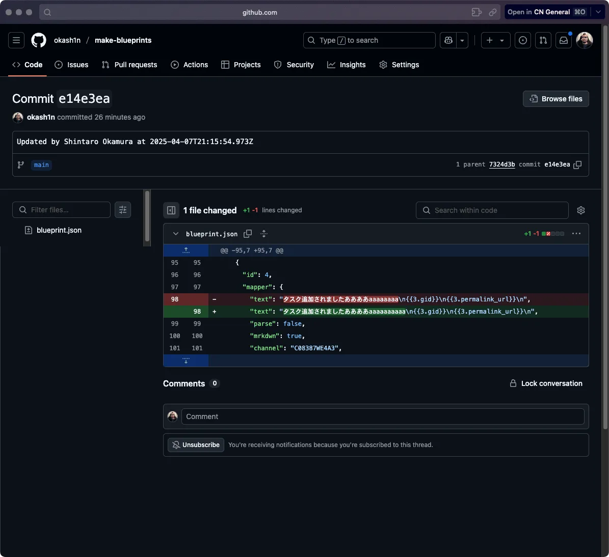 大まかな流れはこんな感じです。GitHubのコミットURLをみれば、どこが変更されたのかがなんとなく分かる、という仕様です。