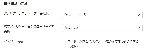 - 設定箇所:アプリケーション画面の [サインオン/認証] タブ > [アプリケーションユーザー名の形式]