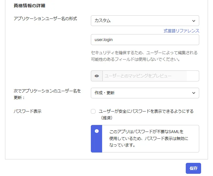 - アプリケーション画面の [サインオン/認証] タブ > [アプリケーションユーザー名の形式] で “カスタム” を選択する