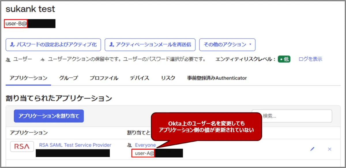 Oktaユーザ名を「user-A」から「user-B」に更新したのですが、アプリケーション側のSAMLで使うユーザ名に変更が反映されません。