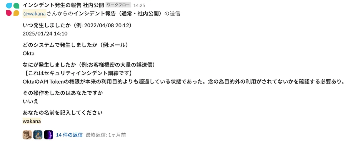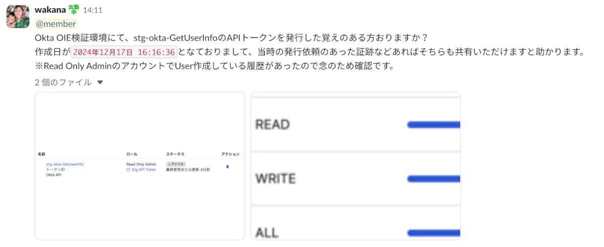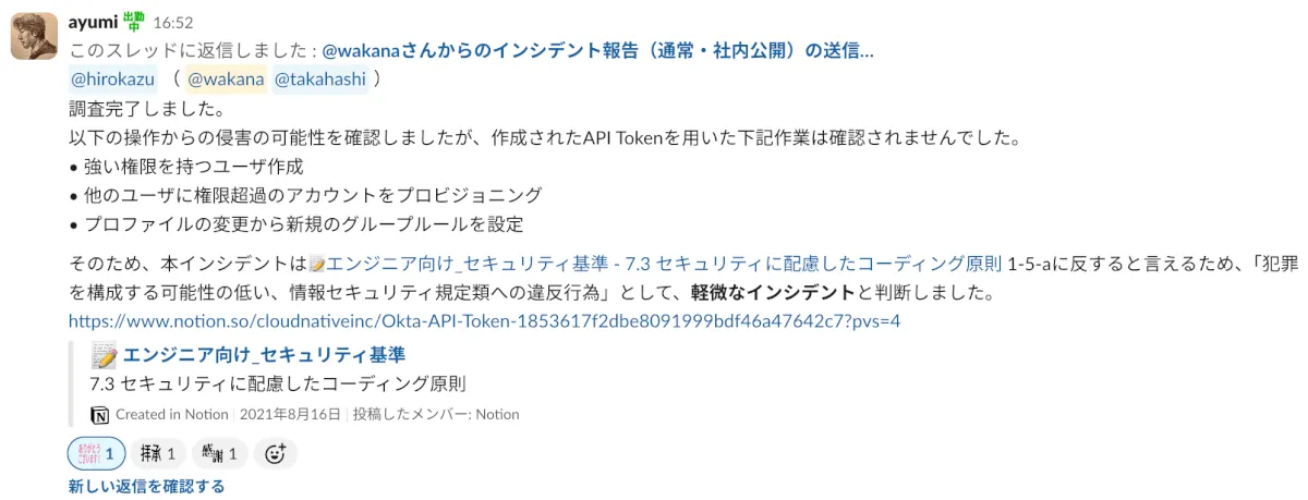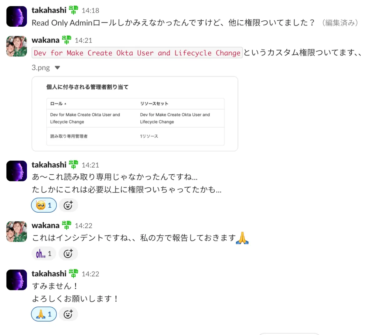 訓練当日、私はOkta管理コンソールにログインしました。そこで、新規のTokenが発行されていることを発見しました。権限が超過している可能性を疑い、Slackで担当者を確認しました。のりぴーさんが対応を開始し、権限超過が判明しました。私はすぐにインシデントフローを開始しました。