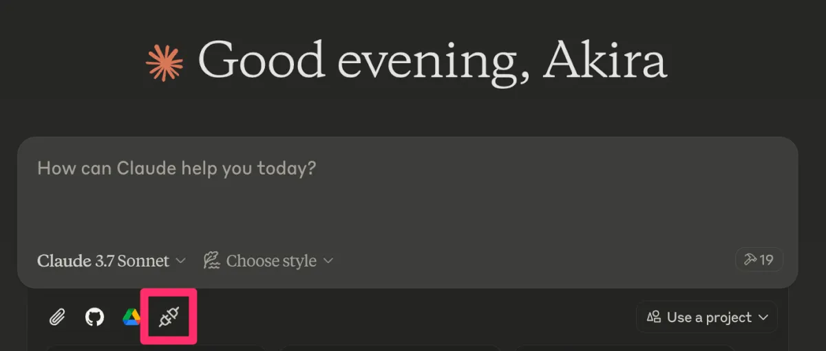 Claude Desktopを起動し、MCPが利用出来る状態になっているとコンセントのようなマークが表示されます。