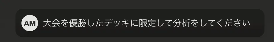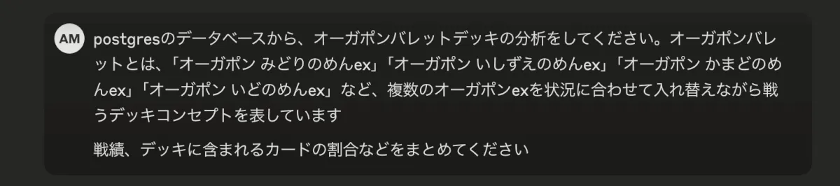 それでは実際に、プロンプトを入力してデッキ分析を行ってもらいます。いま利用者が増えている非常に強力なデッキ、オーガポンバレットについて分析をして貰います。