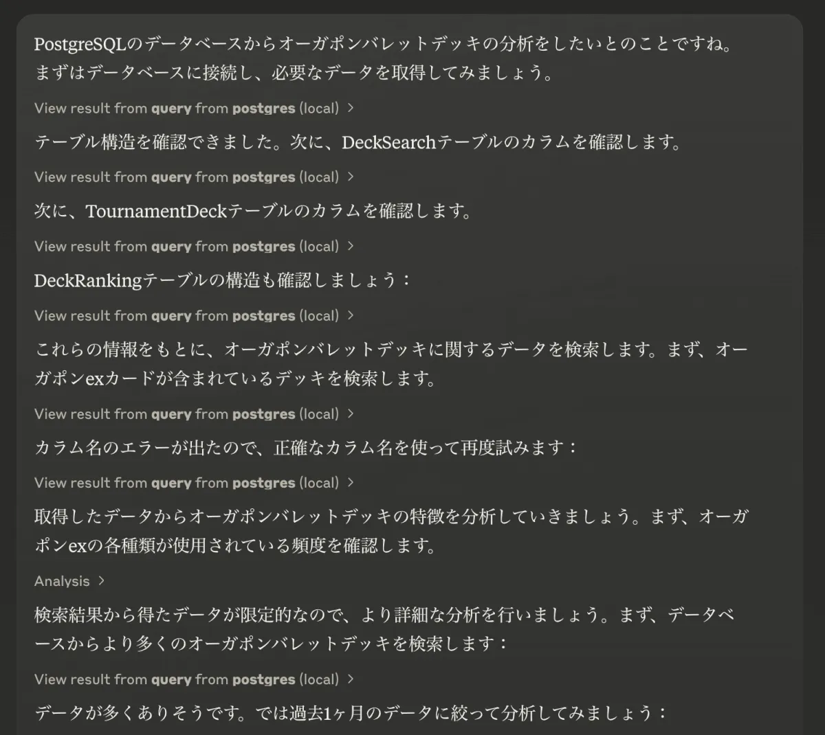 ポケモンカードゲーム自体は歴史のあるゲームなので、Claude自体がゲームルールは理解していますが、最新カードの役割等の情報は一切持ち合わせていなくとも、ポケカ初心者の筆者には十分すぎる分析になり、デッキ同士の相性、対戦結果、カード情報(カードの役割)などの情報が揃えば、さらに高度な分析が可能になるため、Claude MCP + Claude 3.7 Sonnetの凄まじさを痛感しています。