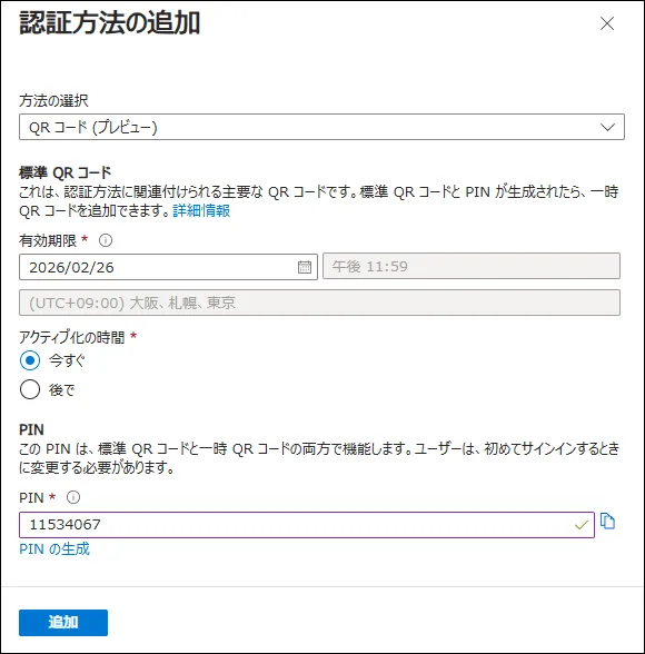 ユーザー単位でQRコードと初期PINコードを発行する必要があります。 手段としては [Entra ID管理センター/Graph API/My Staffアプリ] の3種類が提供されていますが、ここでは [Entra ID管理センター] の手順を記載します。