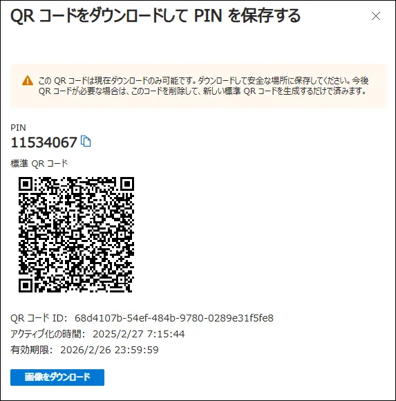 - 払い出されたQRコードを、初期PINコードと共にエンドユーザーへ共有