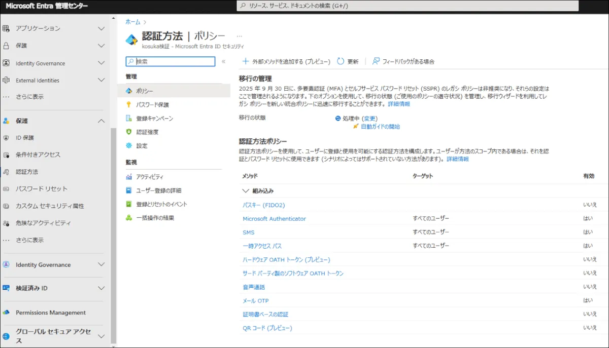 - Entra ID 管理センター(https://entra.microsoft.com/)にて、[保護]- [認証方法] – [ポリシー] – [QRコード(プレビュー)] をクリック