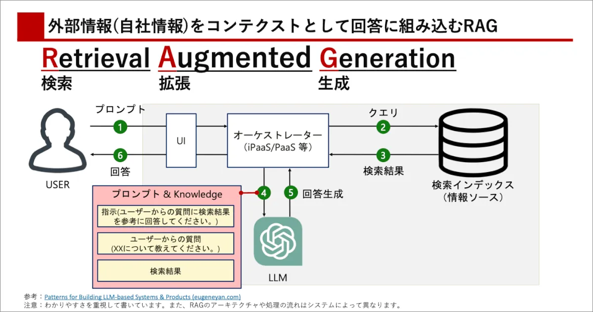 RAG(Retrieval-Augmented Generation)という言葉は、2020年Meta/Facebookが出した論文が最初といわれていますが、古くからその考え方は存在しており、検索の補助として機械学習を用いてより精度の高い回答を動的に生成するという考え方です。