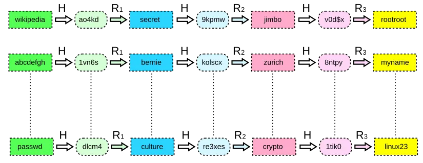 この処理をさらに効率化させる仕組みがレインボーテーブルといわれるものを活用した攻撃です。