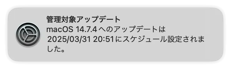 続いて宣言型デバイス管理によるmacOSのアップデートが設定されたよ、という通知が右上に表示されます。