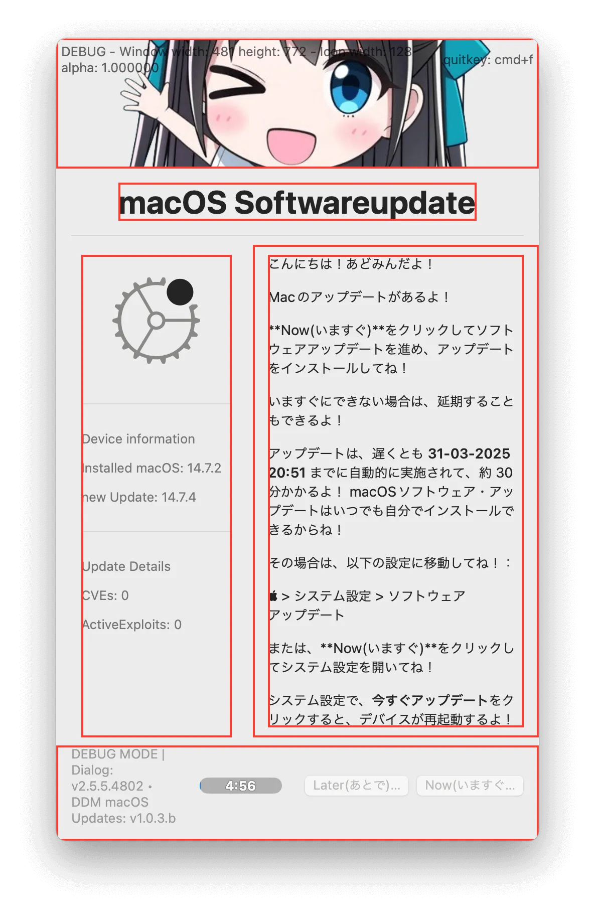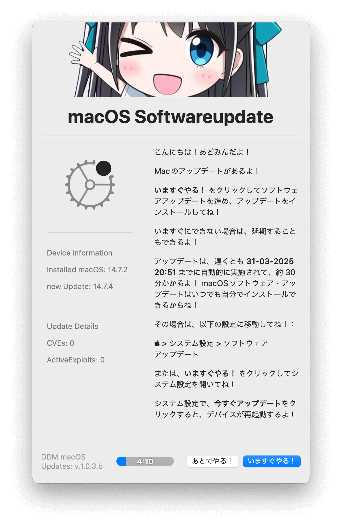 こんにちは!あどみんだよ!\n\nMacのアップデートがあるよ!\n\n**%Install_Button_Custom%** をクリックしてソフトウェアアップデートを進め、アップデートをインストールしてね!\n\nいますぐにできない場合は、延期することもできるよ!\n\nアップデートは、遅くとも **%forceInstallLocalDateTime%** までに自動的に実施されて、約 30 分かかるよ!\nmacOSソフトウェア・アップデートはいつでも自分でインストールできるからね!\n\nその場合は、以下の設定に移動してね!:\n\n > システム設定 > ソフトウェアアップデート\n\nまたは、**%Install_Button_Custom%** をクリックしてシステム設定を開いてね!\n\nシステム設定で、**今すぐアップデート**をクリックすると、デバイスが再起動するよ!ポリシーの作成
