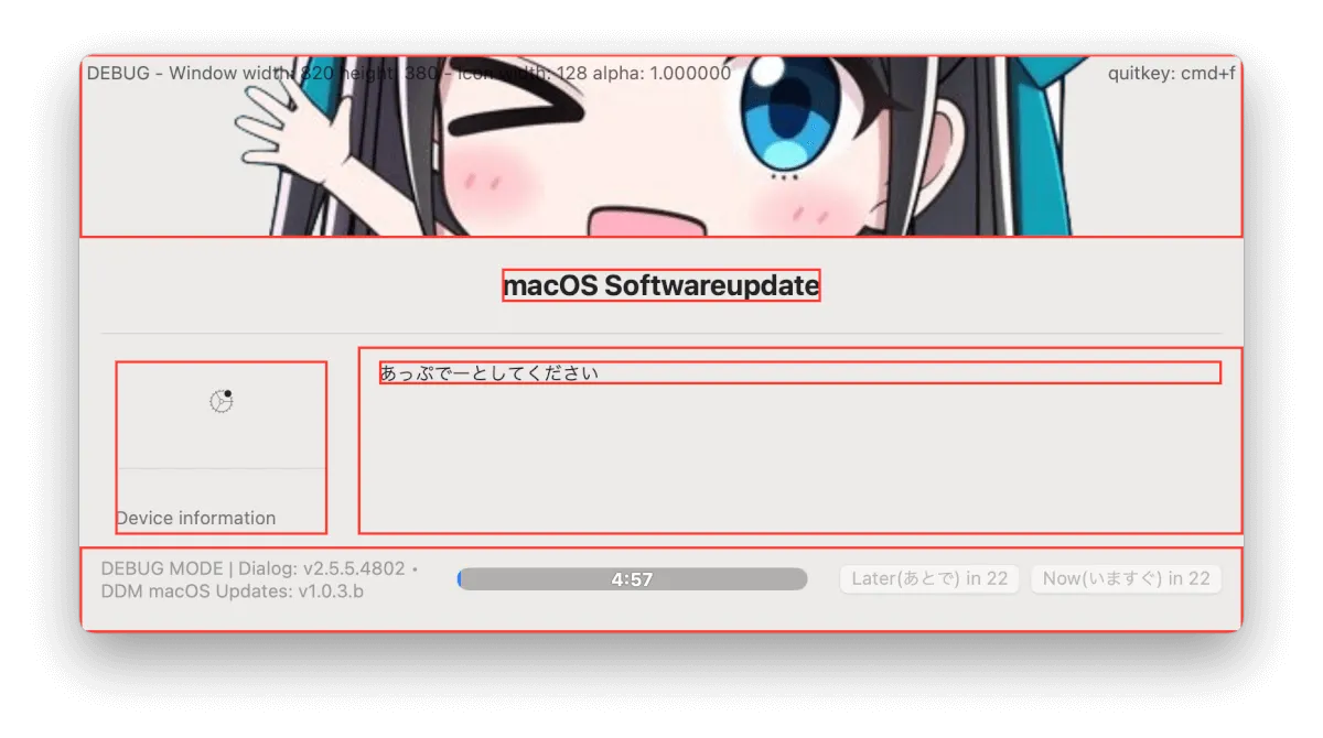 Hello %REAL_NAME%,\n\nA system update is available for your Mac.\n\nClick **%Install_Button_Custom%** to proceed with the software update and install the update.\n\nIf you are unable to start the process at this time, you have the option to defer it.\n\nThe update will be automatically enforced by **%forceInstallLocalDateTime%** at the latest. The process takes about 30 minutes.\nYou can install the macOS software update at any time yourself.\n\nTo do so, please go to:\n\n > System Preferences > Software Update\n\nOr click **%Install_Button_Custom%** to open System Preferences.\n\nIn System Preferences, you can then click **Update Now**, and the device will restart.- テストで作成したサンプル