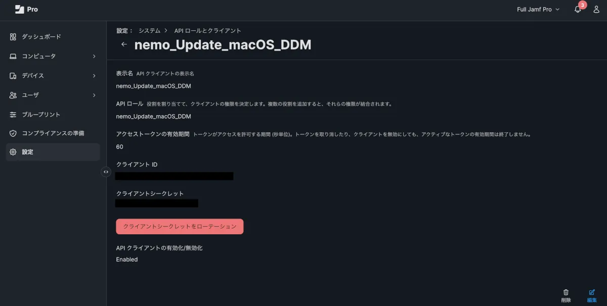 - Jamf Pro管理コンソール > 設定 > システム > API ロールとクライアント を開きます。