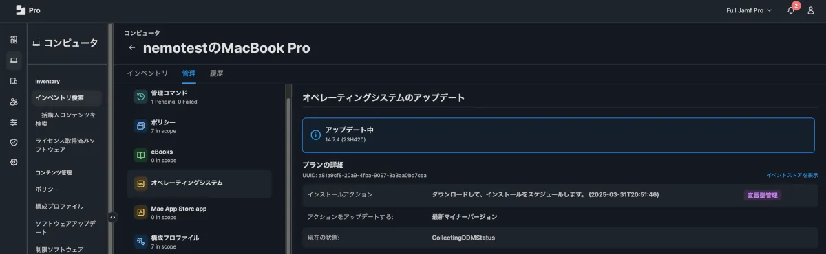 Jamf Pro管理コンソール > コンピュータ > インベントリ検索 > 該当Macのインベントリ > 管理タブ > オペレーティングシステム でも宣言型デバイス管理によってスケジュールされていることが確認できます。