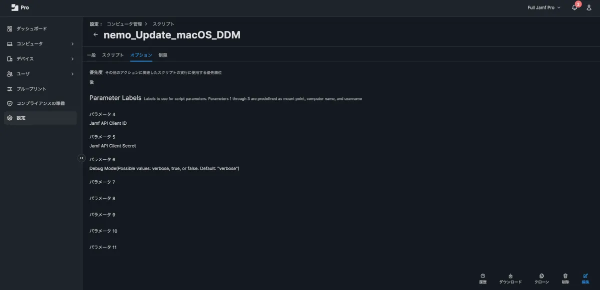 - パラメータ4(Jamf API Client ID)に「Jamf Pro API 認証情報の作成」の手順で作成したクライアント IDを入力します