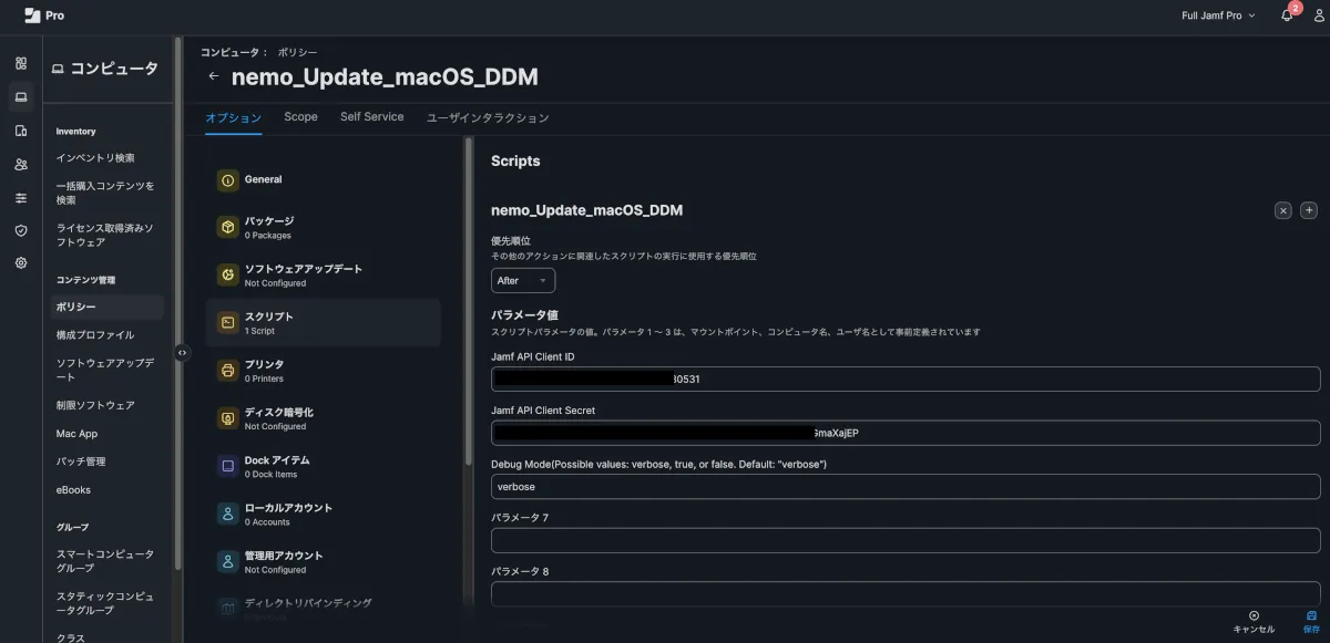 - パラメータ5(Jamf API Client Secret)に「Jamf Pro API 認証情報の作成」の手順で作成したクライアントシークレットを入力します