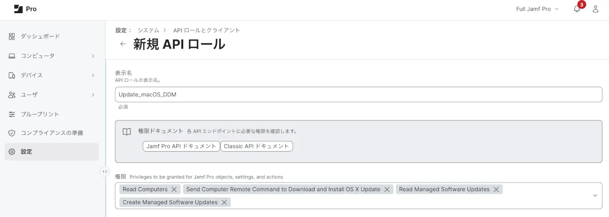 - ブートストラップトークンの保存状態の確認やDDMを利用したアップデートの実行をAPI経由でJamf Proに仕掛けるために必要となります