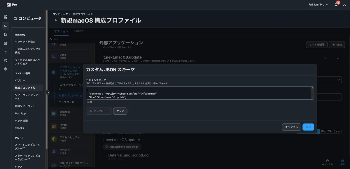 - “+ スキーマを追加” > アップロード より入手した「macOS_Updates_DDM_Profile.json」をアップロードし、”保存”します。