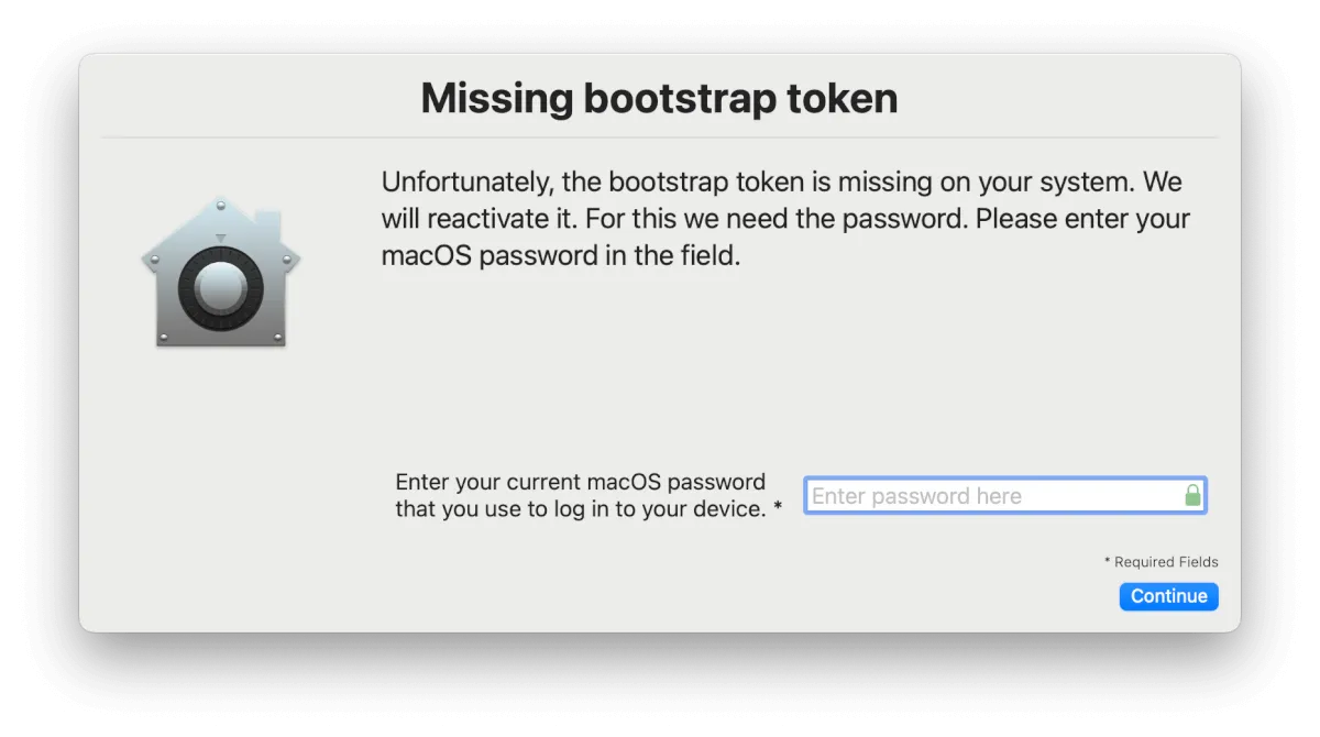 まず、ブートストラップトークンがJamf Proにエスクローされていない場合はこのような画面が表示され、エンドユーザーのパスワードが求められます。