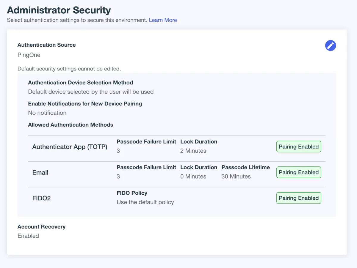 管理者がPingOne管理コンソールにサインインする際に使う認証方式の設定ができます。左メニューの、Settingsの中の、Administrator Securityを開きます。