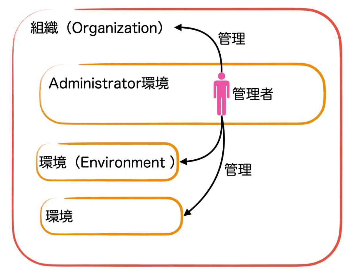 管理者に割り当てるロールによって、組織全体を管理したり、環境を管理したりする権限を付与します。管理者に他の環境を管理する権限を付与できるので、管理対象の環境にアカウントを作成する必要はありません。Administrators環境ではない環境のアカウントに、管理者ロールを付与することもできますが、推奨されていません。管理者アカウントをAdministrator環境に作成することで、管理者向けの各種設定は、独立して行える利点があるためです。