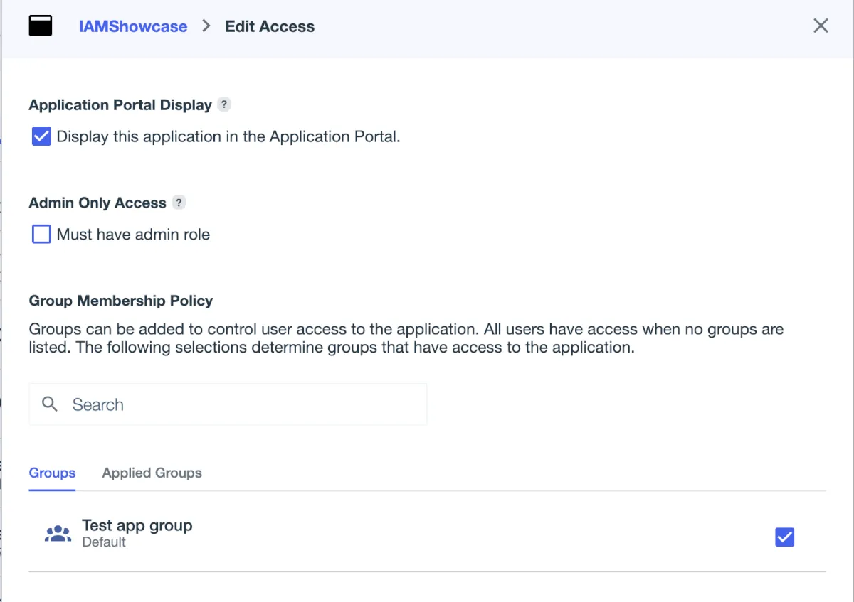 アプリケーションが作成できたら、”Access”タブを開きます。下の方に、先ほど作成したグループが表示されているので、チェックを入れて”Save”ボタンをクリックします。