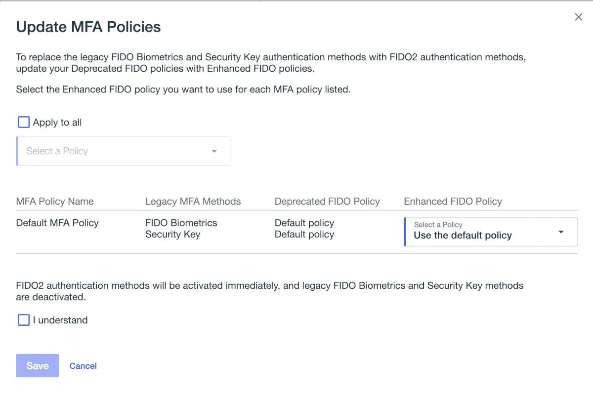 ダイアログが表示されます。現在は、”Default MFA Policy”のみ存在している状態です。今回は特に設定を変更せず、”I understand”にチェックを入れて、”Save”ボタンをクリックします。