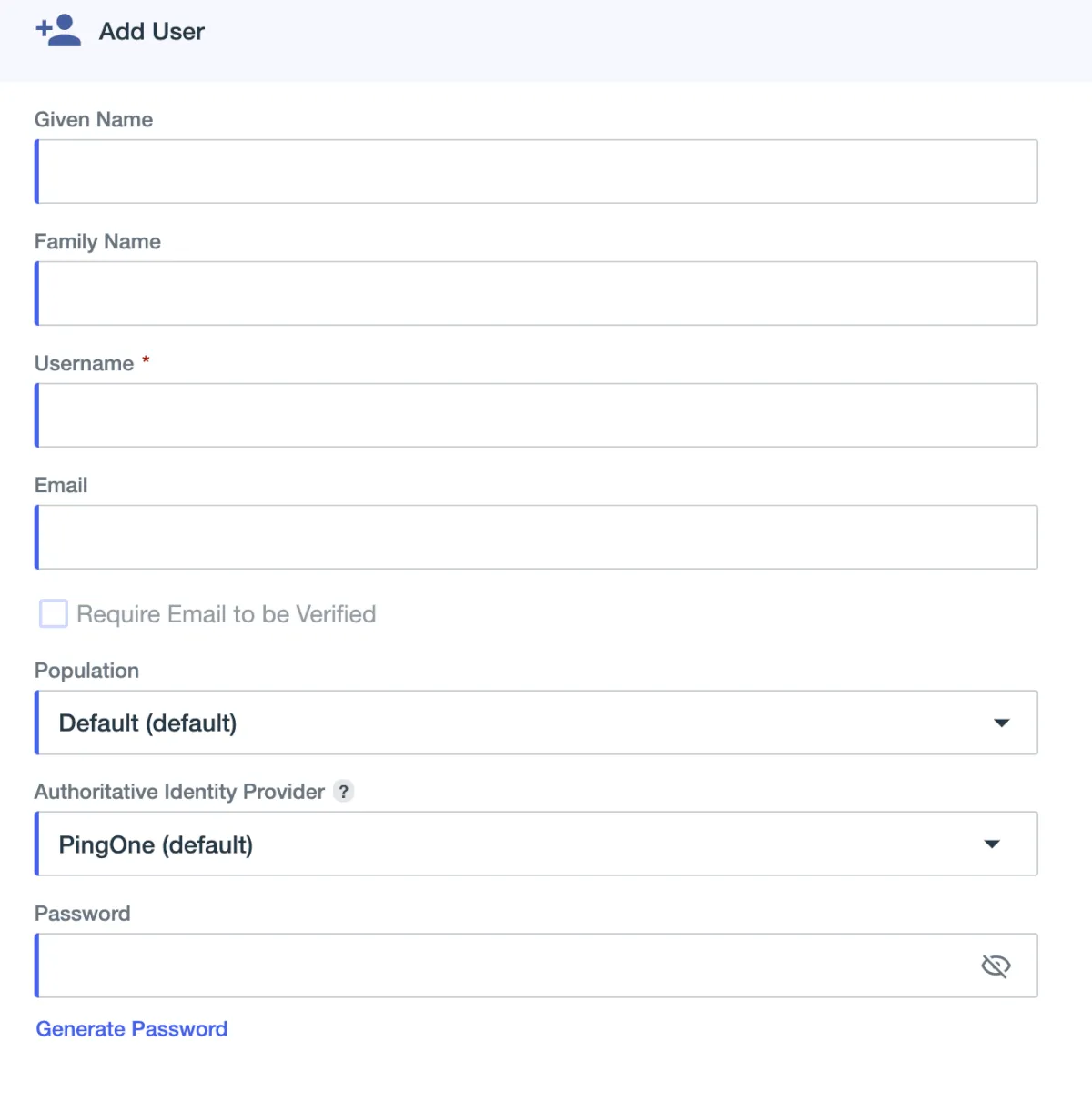 - Password: フィールドの下にある”Generate Password”をクリックすると、自動生成される。PingOneはパスワードを登録せずにユーザーを作成することもできる。