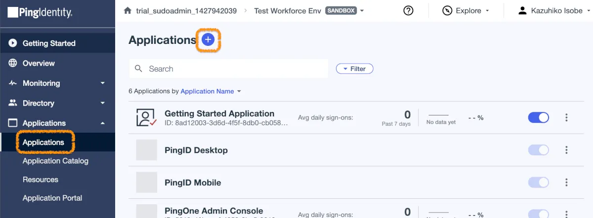 PingOne管理コンソールに戻り、左メニューの”Applications” -> “Application”を開き、”+”ボタンを押します。