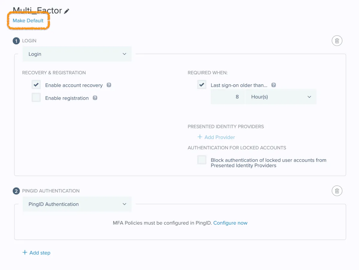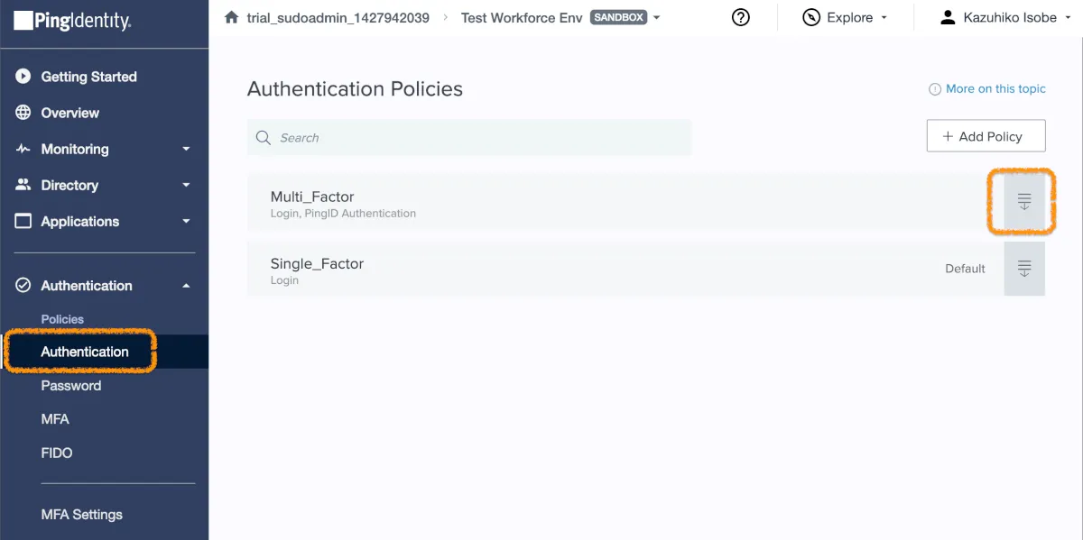 PingOneのデフォルトでは認証ポリシーの設定が不十分なので、適切な形に変更します。