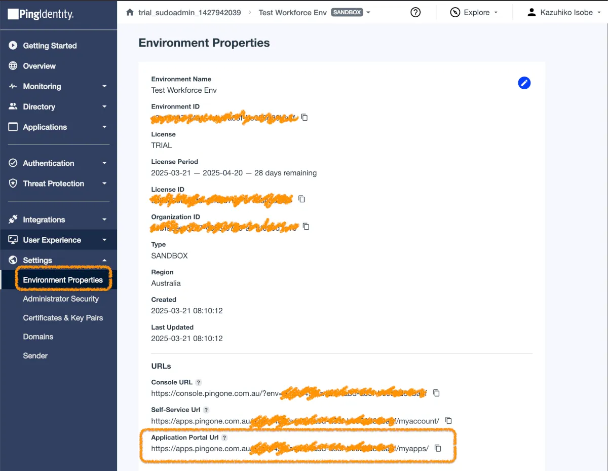 まず、アプリケーションポータルのURLを取得します。PingOne管理コンソールの左メニューから、”Settings” -> “Environment Properties”を”開きます。