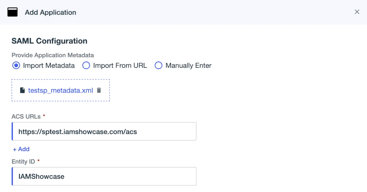 “Import Metadata”が選択された状態で、”Select a file”をクリックすると、ファイル選択ダイアログが表示されるので、先ほどダウンロードしたメタデータファイルをアップロードします。