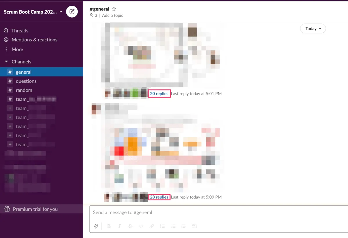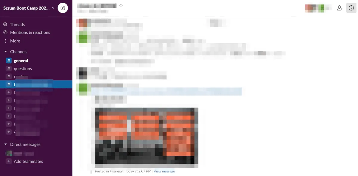 チーム内のタイムラインです。 ZoomとSlackでメンバー全員が画像と文字で積極的な情報交換が行われました。 画面内のスクリーンショットは #General に貼られたスライドを個別のチーム内に貼り見やすくするなど、タイムラインの使い方もチームごとで多様でした。