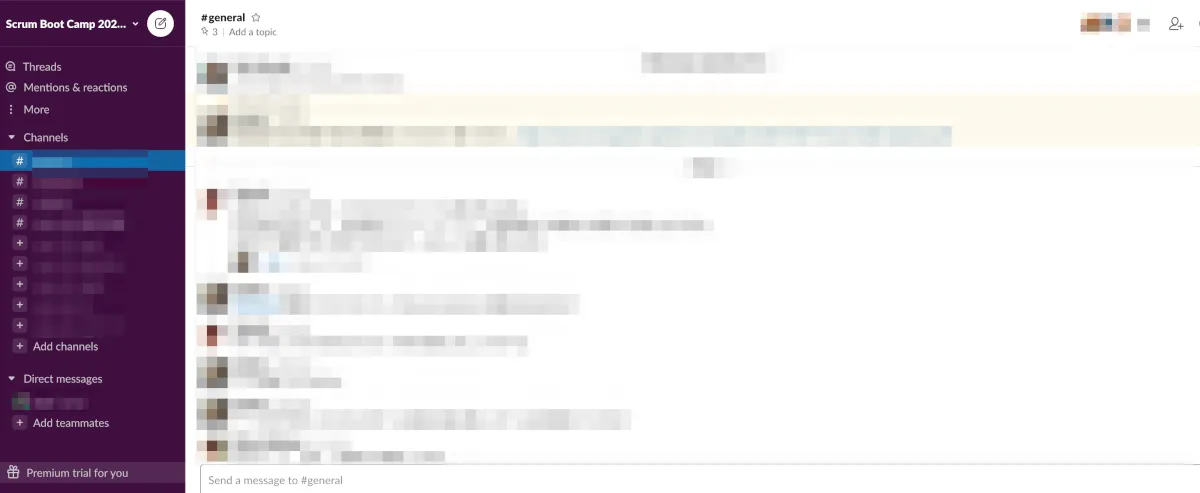 研修の観点から内容をお見せする事はできませんが、全員が終日見ていたSlack上の画面です。