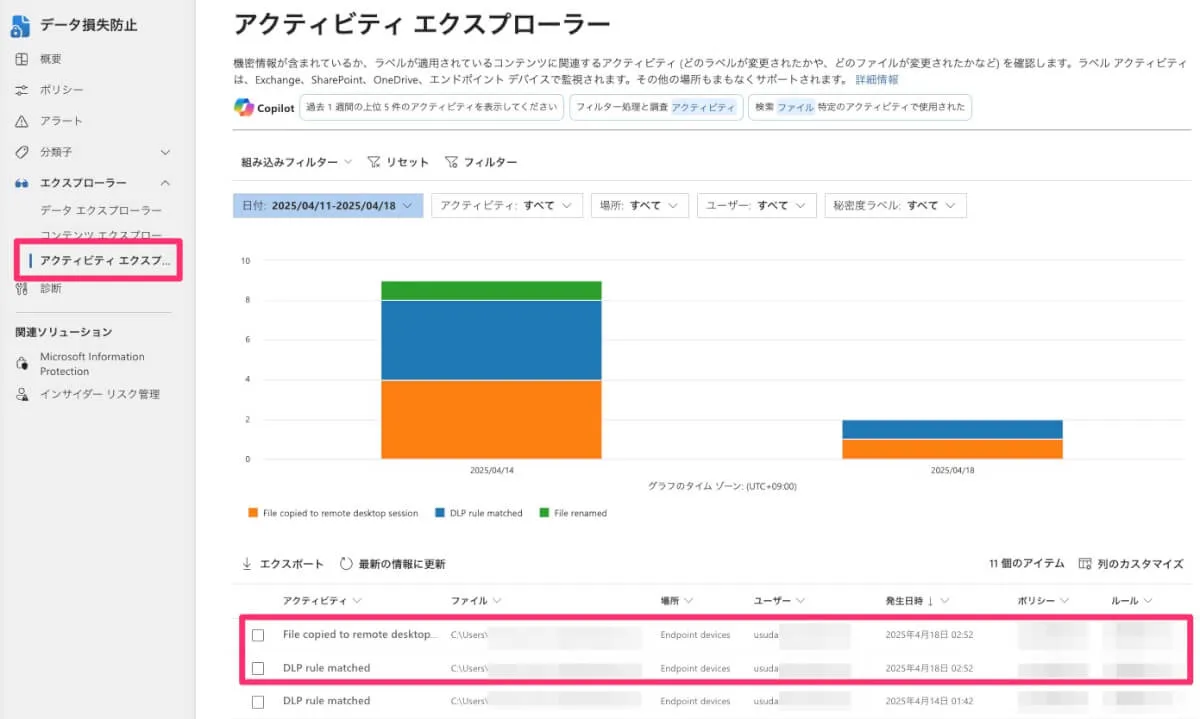 「DLP rule matched」と「File copied to remote desktop session」が検出されました。