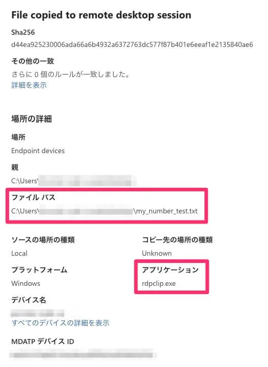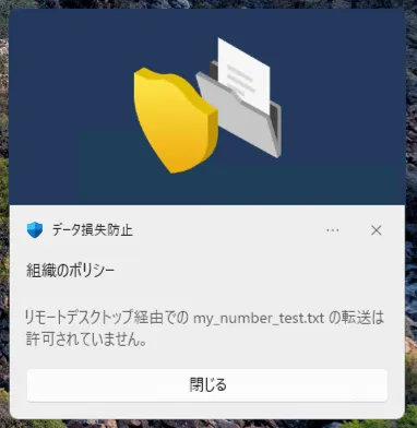 エンドポイントのWindowsにRDP接続し、コピーをすると以下のように検出されました。