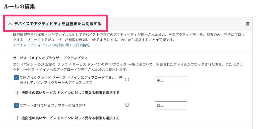 制限する操作として「デバイスでアクティビティを監査または制限する」にて各種アクションを選択します。