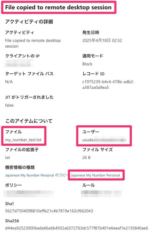 確認するとファイル名や対象のユーザー、どの機密情報の種類なのかが確認できたり、