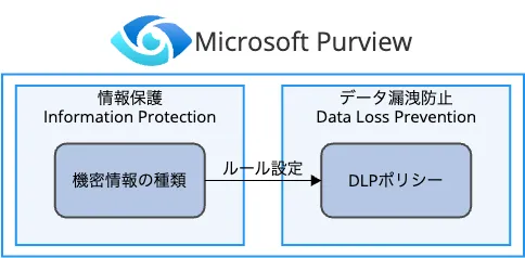 Microsoft PurviewのエンドポイントDLPでは様々な機密情報の移動を制御することが可能です。Information Protectionにある「機密情報の種類」をDLPの「ポリシー」に組み込むことで制御できます。簡単に書くと以下の図のイメージです。