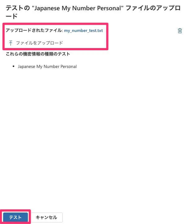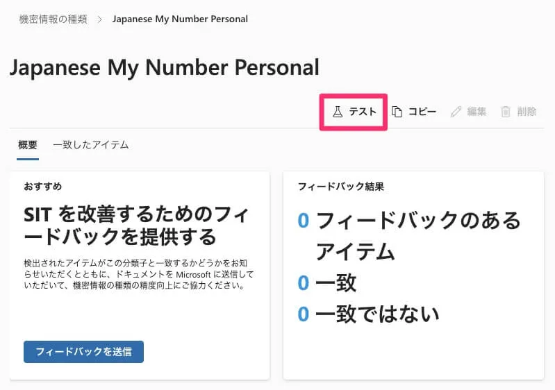 「機密情報の種類」はPurviewの画面上でテストを実行できます。先程確認した仕様に対して、実際にどのようなファイルがどう判定されるかテストしていきましょう。