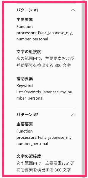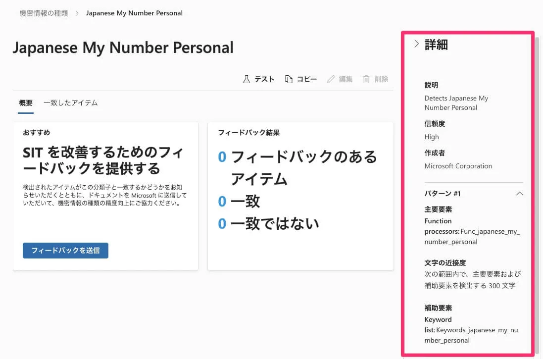 「情報保護 -> 分類子 -> 機密情報の種類」にて「Japanese My Number Personal」を選択して詳細を表示すると以下のように右カラムに詳細情報として、どのような内容になっているか見えます。