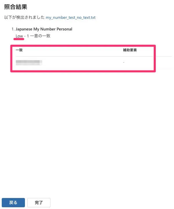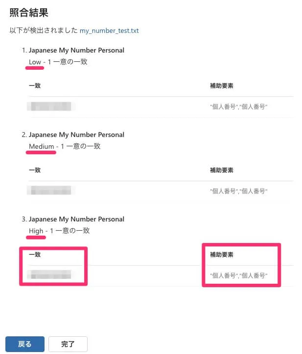 照合結果として、High, Medium, Lowがそれぞれ検出されました。なぜMediumもあるのかは謎ですが、少なくとも結果的にはHighとして扱われそうです。マイナンバーだけでなく、補助要素の「個人番号」と合わせて検出していることからHighの判定になっていることがわかります。