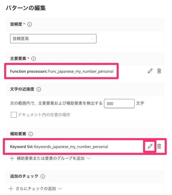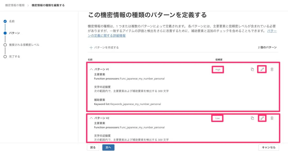次のページに進むと詳細な定義を確認できます。2つのパターンがありましたが、それぞれ信頼度がHighとLowだったんですね。そしてパターンごと編集でさらに詳細を確認してみます。