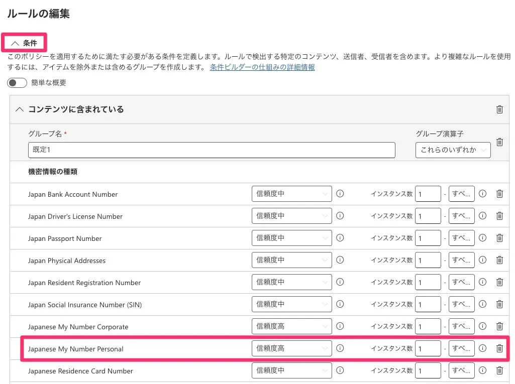 DLPポリシーのルールを編集し、条件に「機密情報の種類」を設定します。