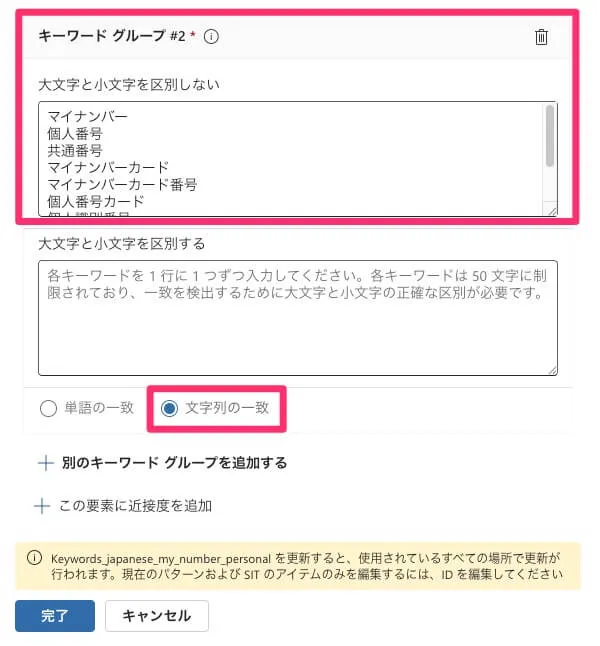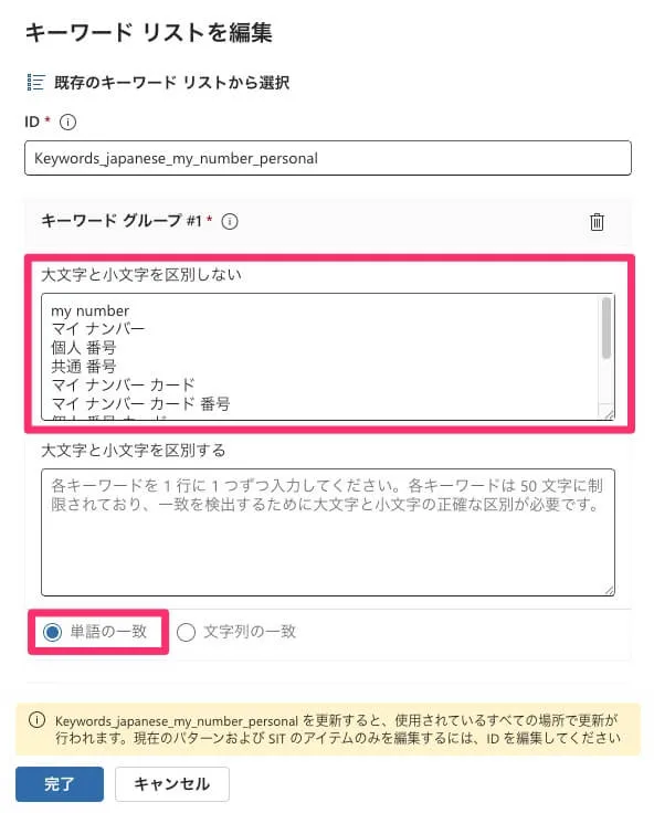 一方でキーワードのリストは以下のように確認できました。「個人 番号」「マイ ナンバー」などマイナンバーと関連する語句が並んでいます。これらが「単語の一致」で検出するようになっています。