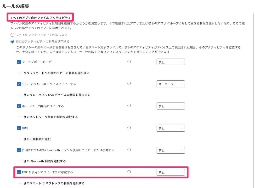 今回は「すべてのアプリ向けファイルアクティビティ -> RDPを使用してコピーまたは移動する」で検出を試しますのでこれを設定します。