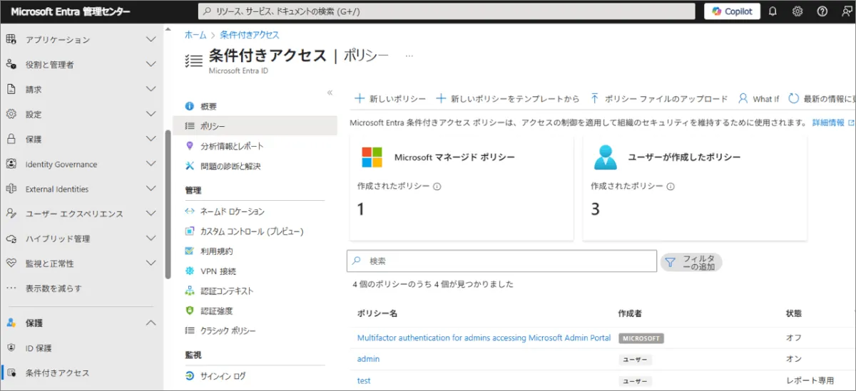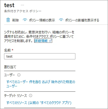 - Entra ID 管理センター(https://entra.microsoft.com/)にて、[保護]- [条件付きアクセス] – [ポリシー] から、影響度を確認したいポリシーをクリック(今回はレポート専用モードで展開している