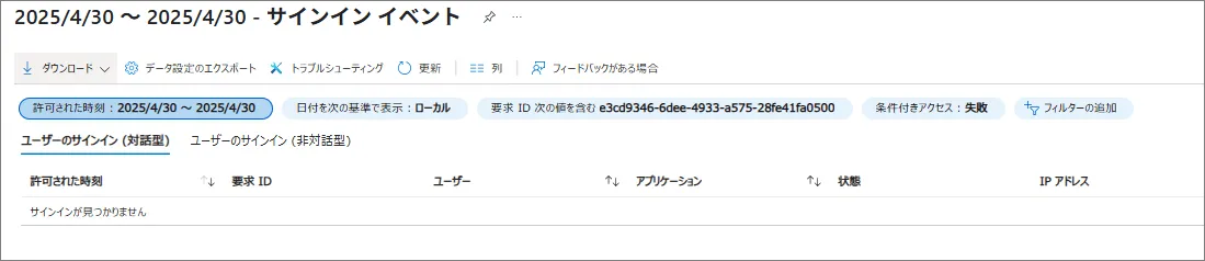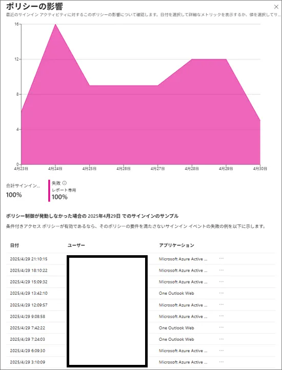 - 表示された画面には条件付きアクセスで評価されたか結果が集計/表示されるため、[期間/結果] を用いて出力を調整(今回はわざと全て失敗となるようなポリシーを組んでテストしています)