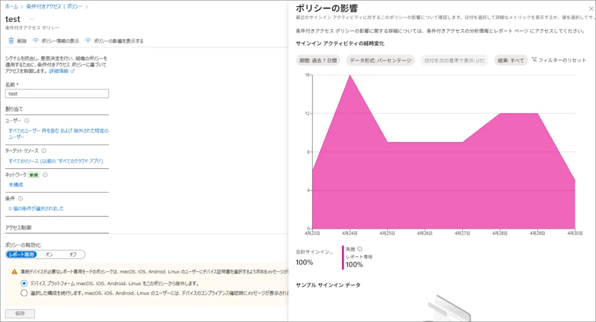 - 条件付きアクセスポリシーでは、本番展開前にレポート専用モードを使用して影響度を調査することが推奨されています